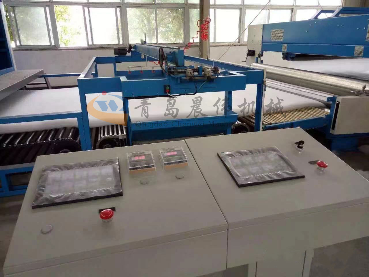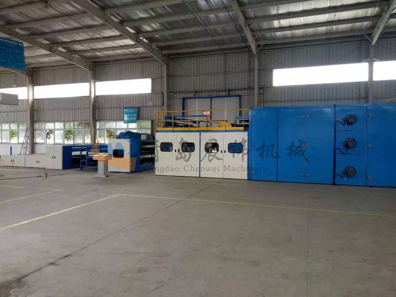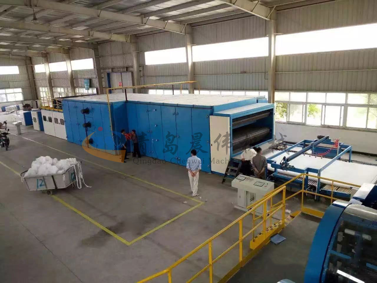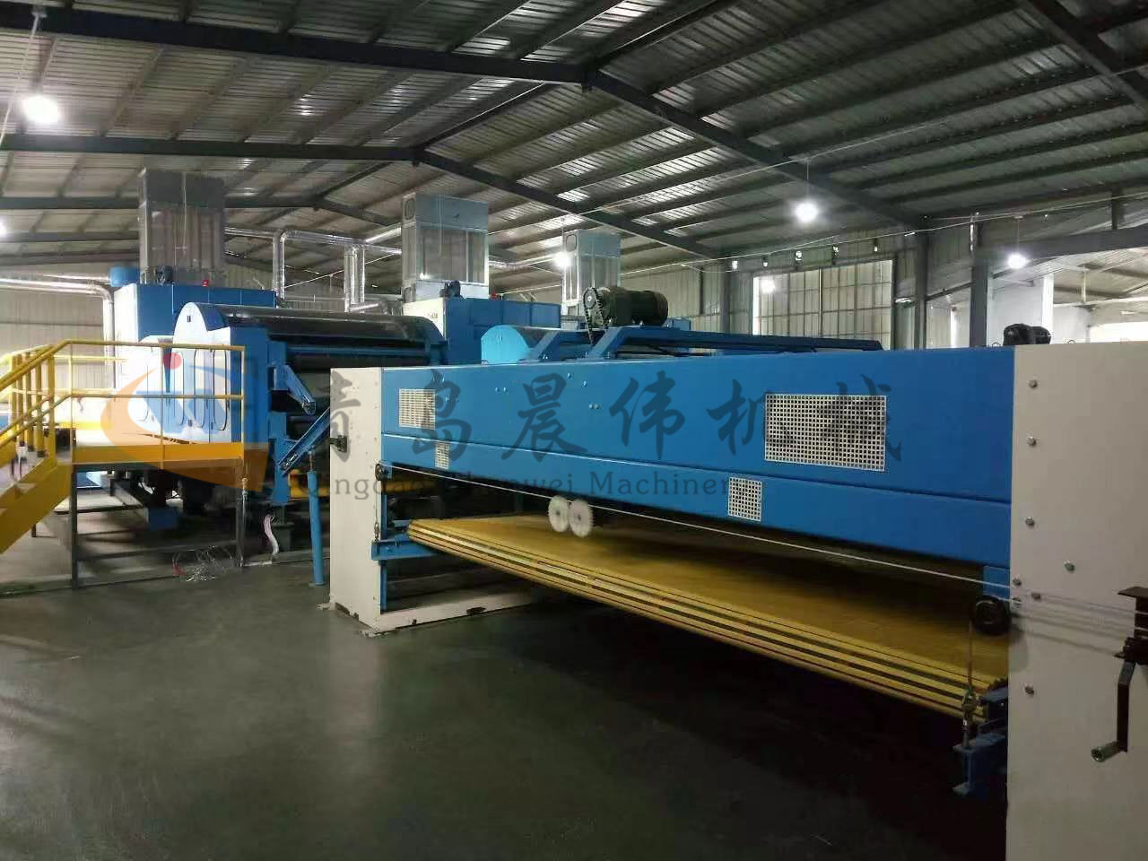 5. CWPW-鋪網機:用于將梳理纖網通過移動小車交叉折疊為所需幅寬和定量的多層纖網,以供后道工序使用。鋪網輥采用特殊結構,加裝壓網輥和導流板,不飄網不起皺,五只大功率電機精確控制各部件的運動,電動輸出簾高度調節裝置