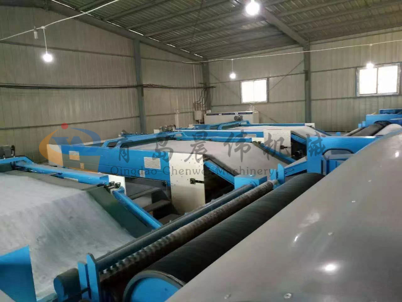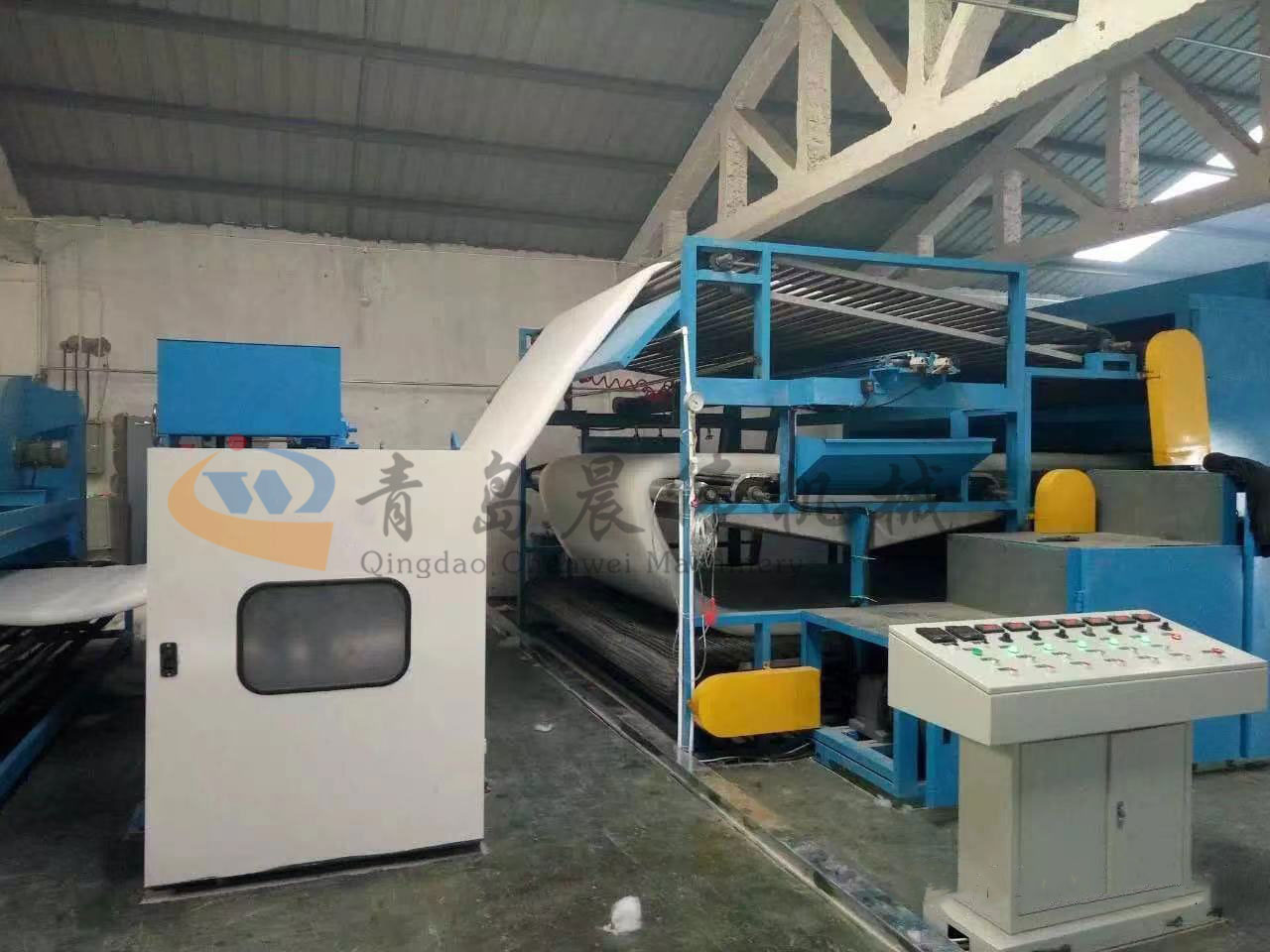 5. CWPW-鋪網(wǎng)機:用于將梳理纖網(wǎng)通過移動小車交叉折疊為所需幅寬和定量的多層纖網(wǎng),以供后道工序使用。鋪網(wǎng)輥采用特殊結(jié)構(gòu),加裝壓網(wǎng)輥和導流板,不飄網(wǎng)不起皺,五只大功率電機精確控制各部件的運動,電動輸出簾高度調(diào)節(jié)裝置